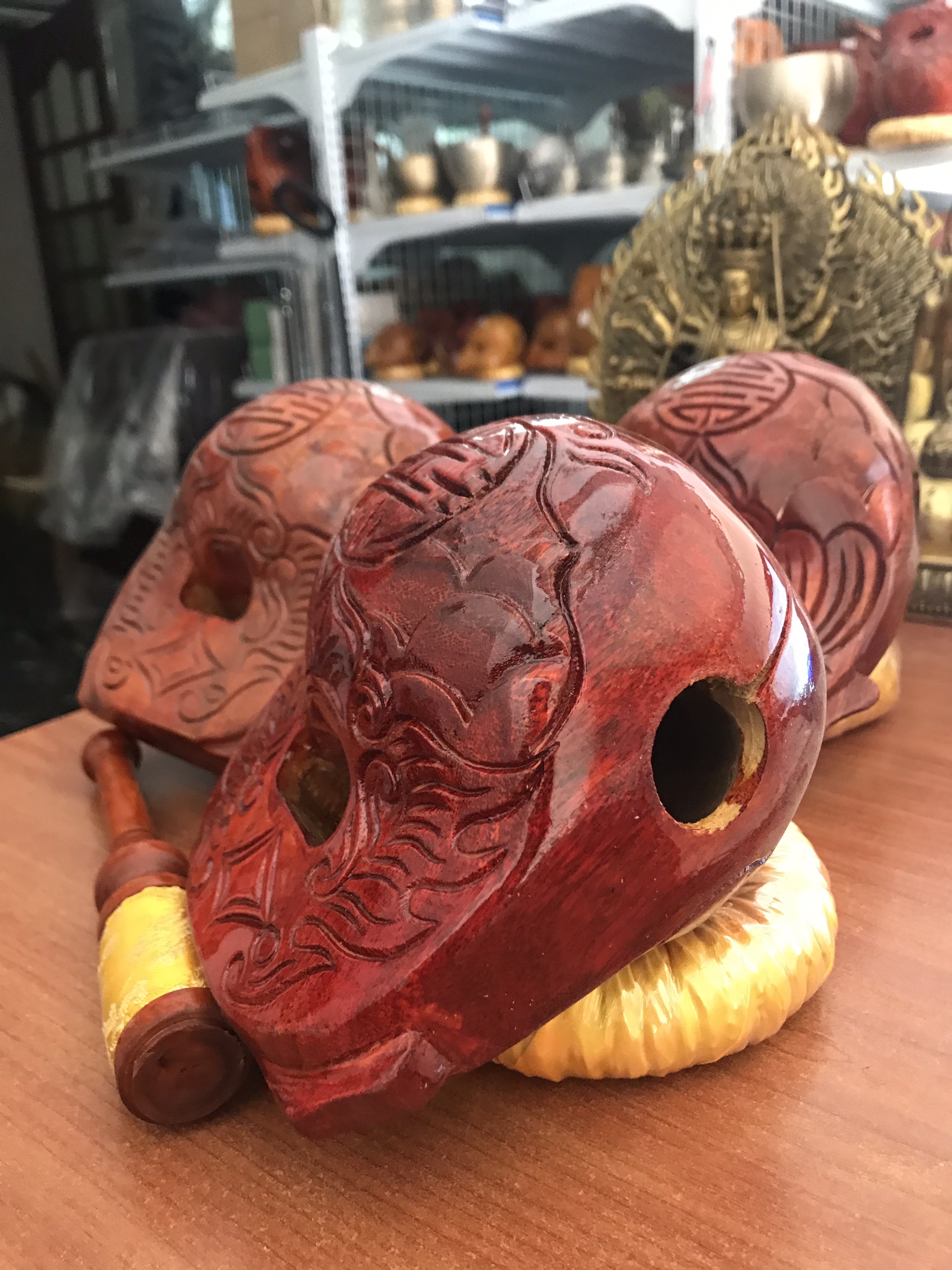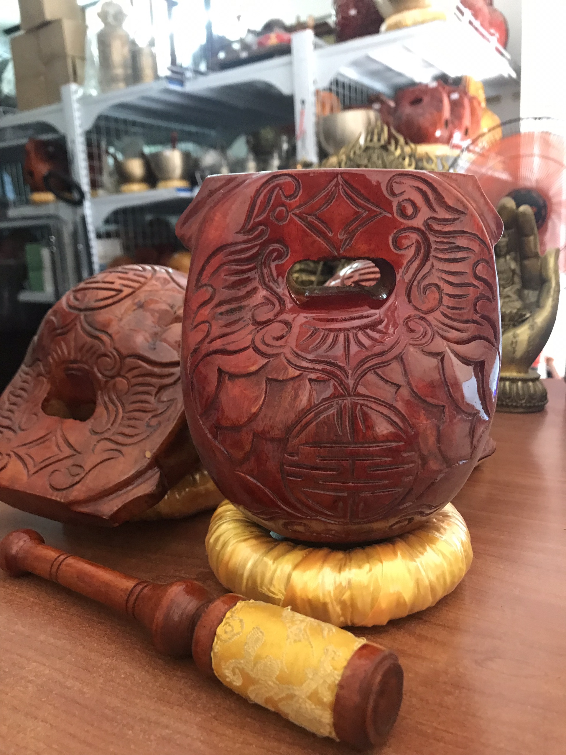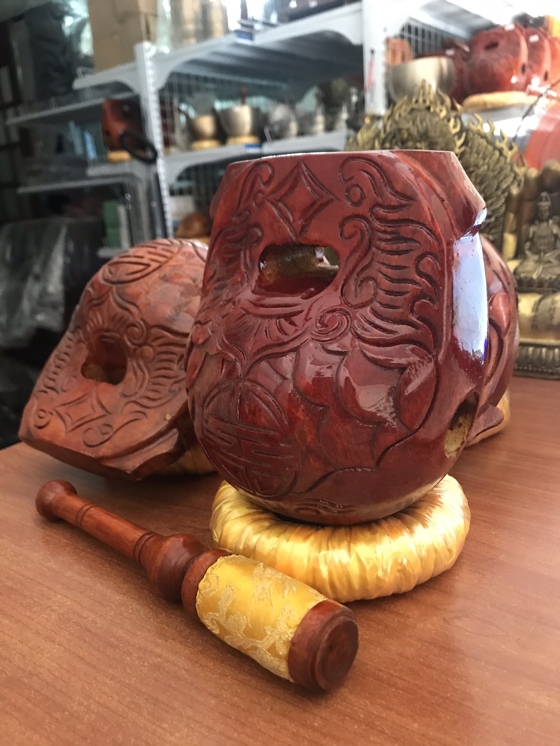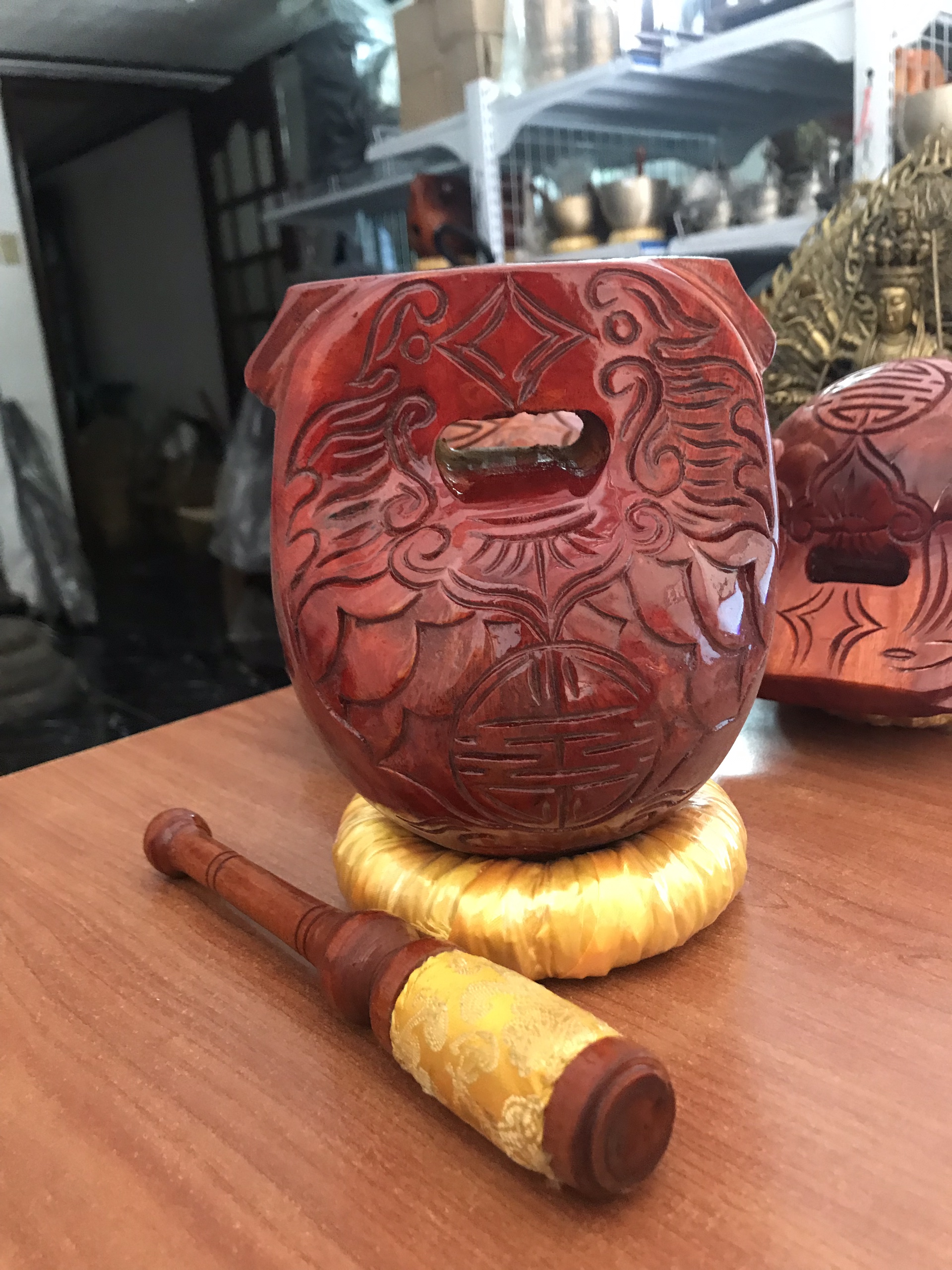 Mõ gỗ Huế có âm thanh hay, tiếng trong trẻo, độ bền của gỗ mít rất cao, màu sắc bóng đẹp, quý khách lưu ý không để nắng mưa , rơi vỡ để ảnh hưởng tiếng mõ.