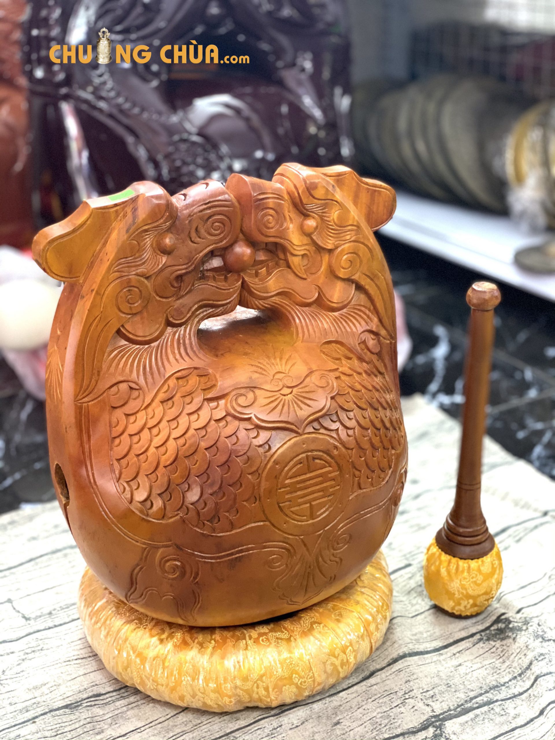 Các hình vảy rồng đều được khắc một cách tinh tế và tỉ mỉ. Sự khéo léo của thợ làm mõ tụng kinh Phong Vân được thể hiện qua chi tiết bên ngoài của mõ một cách nhẹ nhàng.Sản phẩm mang màu vàng gỗ tự nhiên. Khi quý khách hàng lựa chọn mua mõ gỗ mít tụng kinh tại Phong Vân; khách hàng còn được tặng kèm dùi và đế nệm.